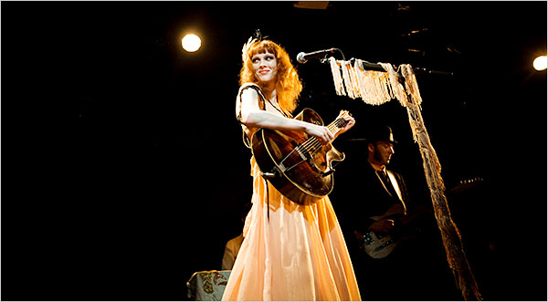 At each gig she took the stage in a peach-dyed vintage gown and a 1917 Gibson Style O guitar to give a preview of her album, “The Ghost Who Walks,” which was produced by her rock star husband (who plays the drums on it) and is due out May 25.