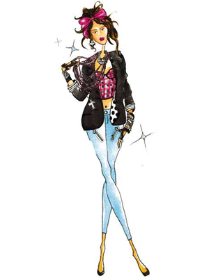 From the sketches, the collection doesn't look to be anything wildly new. There's a little Betsey Johnson in the floral dress, a little Versace in the star print, and a little Madonna in the skinny jeans and bustier combo. If anything, the clothes appear overly sophisticated for the demographic.